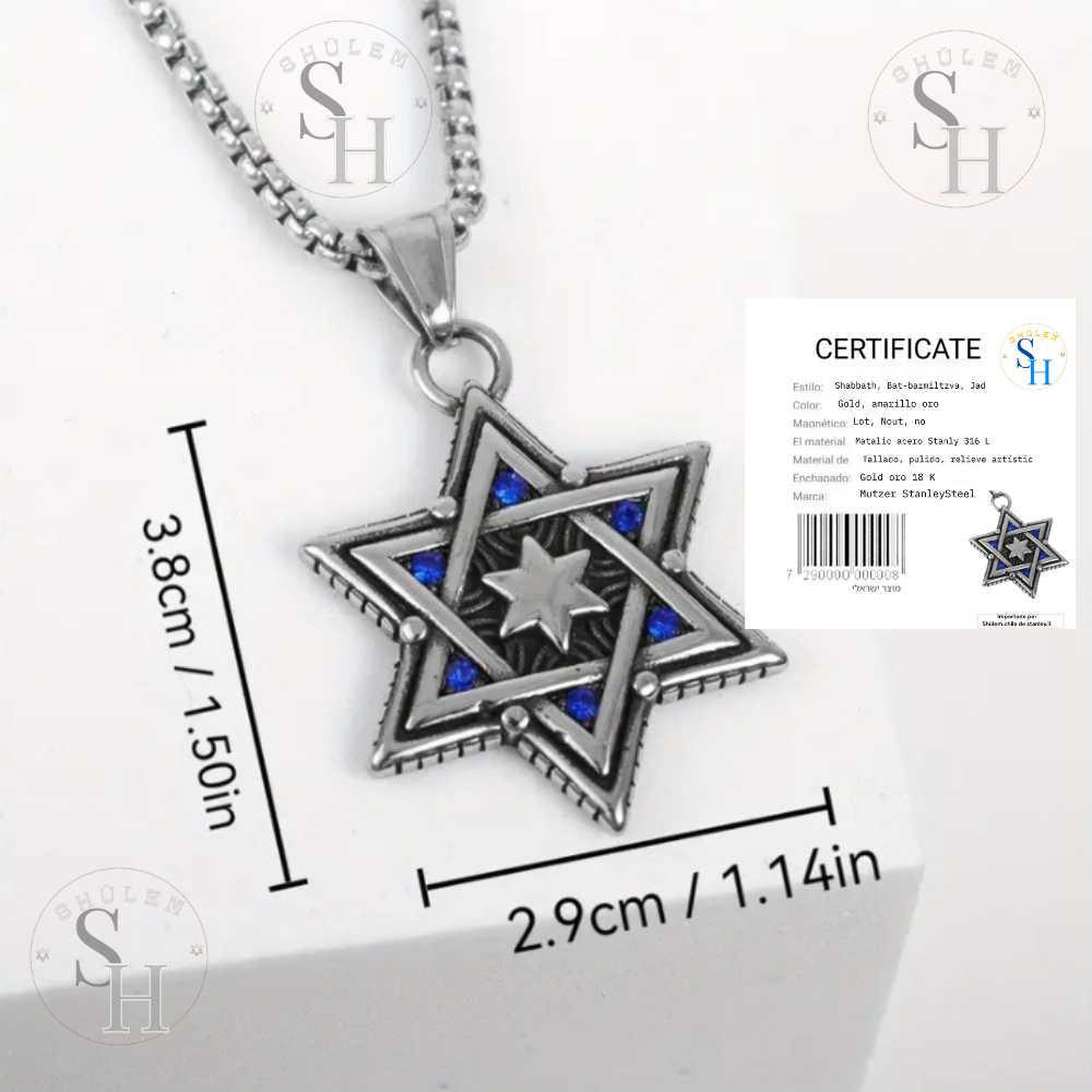La Maguen de Eilat, o también conocido como Exclusivo Estrella de David de Eilat está forjada en acero quirúrgico inoxidable de alta resistencia, con un baño de plata envejecido antialérgico, esta joya garantiza durabilidad y brillo eterno. Su cadena acordonada de 60 cm combina comodidad con sofisticación, permitiendo que la pieza caiga con gracia y estilo, destacando en cualquier ocasión.
