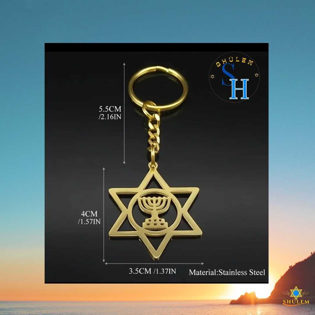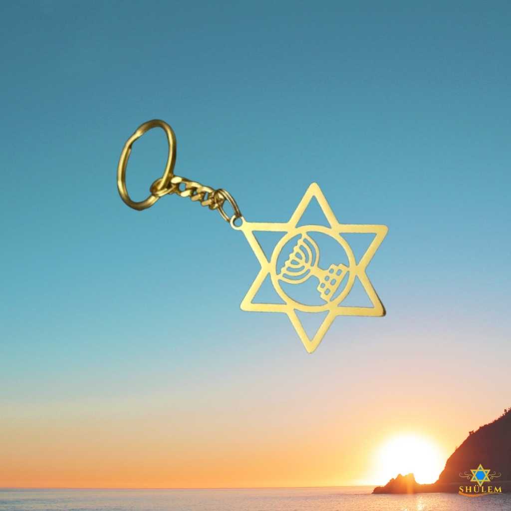 Llavero Maguen David y candelabro de 7 brazos en su centro alrededor de un circulo